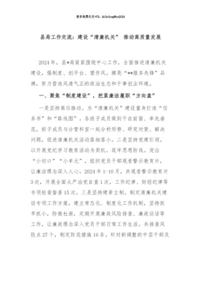 / 【七哥公文】2024年:县局工作交流:建设“清廉机关” 推动高质量发展+更多免费公文+VX:QiGeGongWen2024