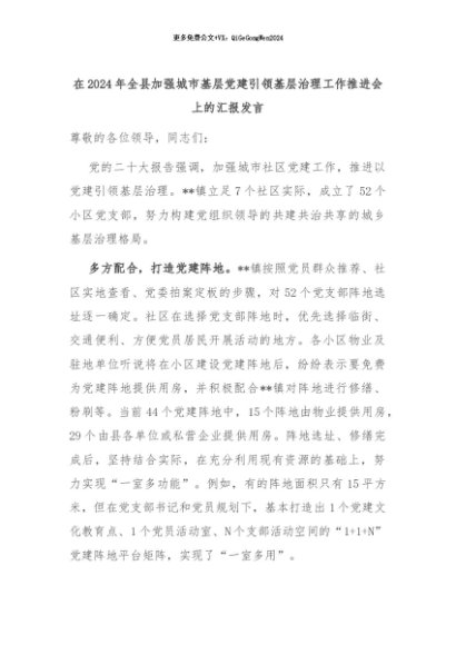 【七哥公文】2024年:在2024年全县加强城市基层党建引领基层治理工作推进会上的汇报发言+更多免费公文+VX:QiGeGongWen2024