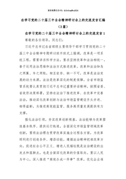 【七哥公文】2024年:(3篇)在学习党的二十届三中全会精神研讨会上的交流发言汇编+更多免费公文+VX:QiGeGongWen2024