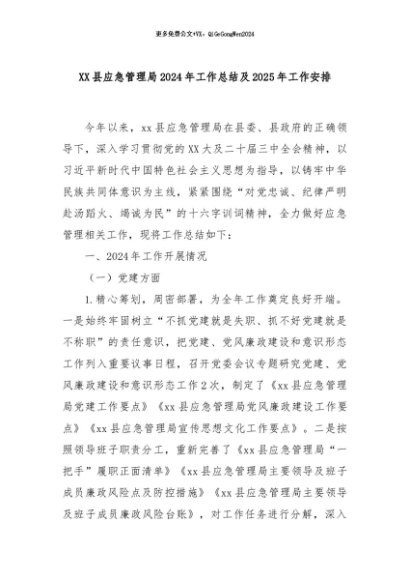 【七哥公文】2024年:XX县应急管理局2024年工作总结及2025年工作安排+更多免费公文+VX:QiGeGongWen2024