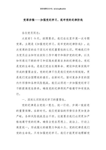 / 【七哥公文】2024年:党课讲稿——加强党纪学习,筑牢党的纪律防线+更多免费公文+VX:QiGeGongWen2024