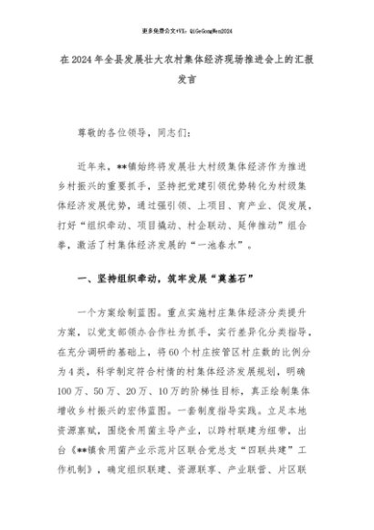 【七哥公文】2024年:在2024年全县发展壮大农村集体经济现场推进会上的汇报发言+更多免费公文+VX:QiGeGongWen2024
