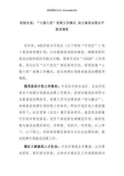 【七哥公文】2024年:经验交流:“七强七促”党建工作模式 助力基层治理水平提质增效+更多免费公文+VX:QiGeGongWen2024