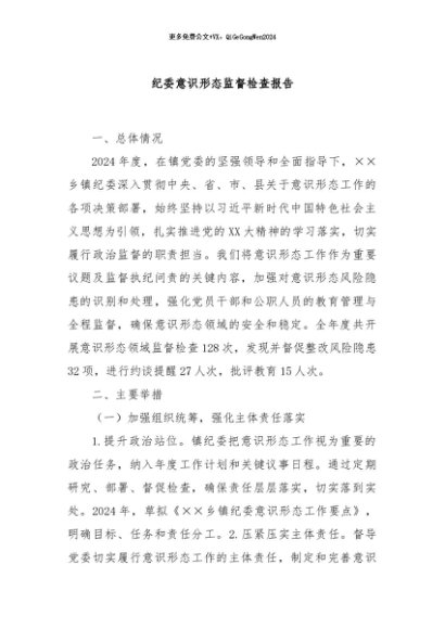 / 【七哥公文】2024年:纪委意识形态监督检查报告+更多免费公文+VX:QiGeGongWen2024