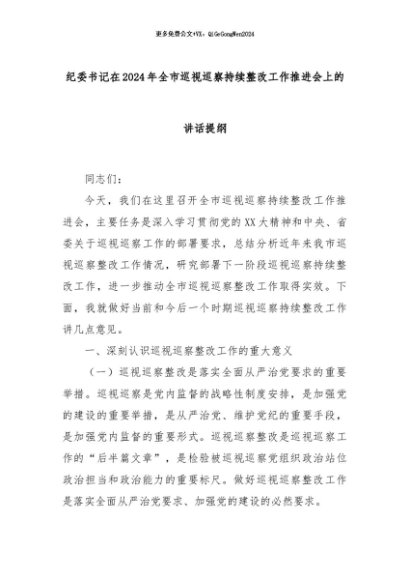 【七哥公文】2024年:纪委书记在2024年全市巡视巡察持续整改工作推进会上的讲话提纲+更多免费公文+VX:QiGeGongWen2024