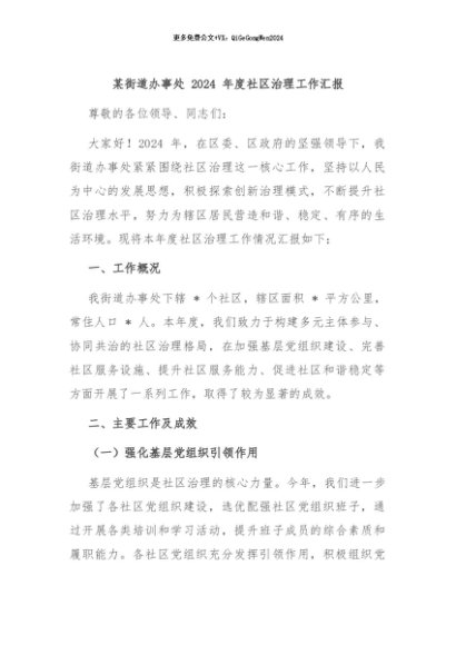 / 【七哥公文】2024年:某街道办事处 2024 年度社区治理工作汇报+更多免费公文+VX:QiGeGongWen2024