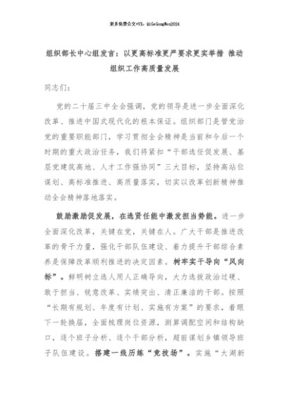【七哥公文】2024年:组织部长中心组发言:以更高标准更严要求更实举措 推动组织工作高质量发展+更多免费公文+VX:QiGeGongWen2024