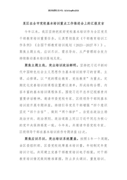 / 【七哥公文】2024年:某区在全市党校基本培训重点工作推进会上的汇报发言+更多免费公文+VX:QiGeGongWen2024