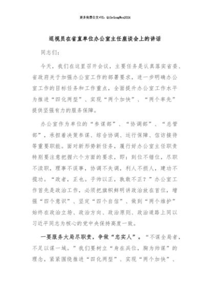 / 【七哥公文】2024年:巡视员在省直单位办公室主任座谈会上的讲话+更多免费公文+VX:QiGeGongWen2024