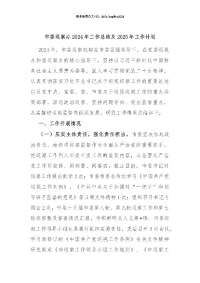 / 【七哥公文】2024年:市委巡察办2024年工作总结及2025年工作计划+更多免费公文+VX:QiGeGongWen2024