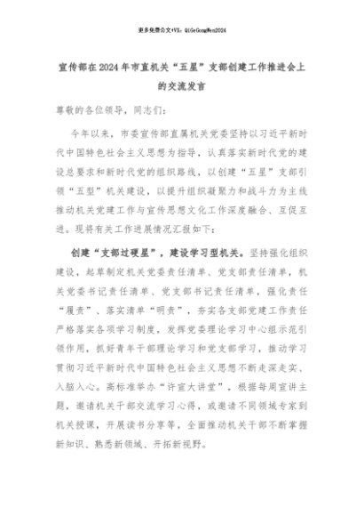 【七哥公文】2024年:宣传部在2024年市直机关“五星”支部创建工作推进会上的交流发言+更多免费公文+VX:QiGeGongWen2024