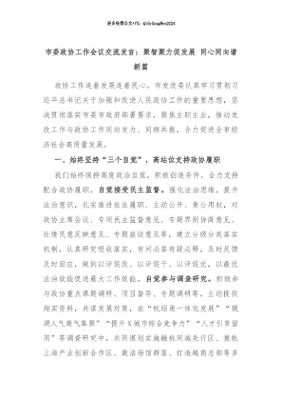 【七哥公文】2024年:市委政协工作会议交流发言:聚智聚力促发展 同心同向谱新篇+更多免费公文+VX:QiGeGongWen2024