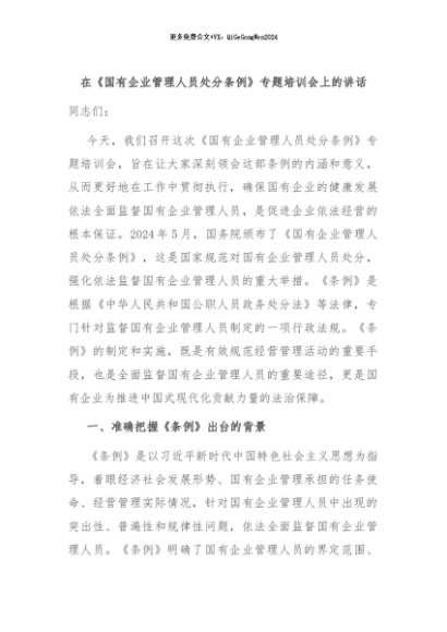 / 【七哥公文】2024年:在《国有企业管理人员处分条例》专题培训会上的讲话+更多免费公文+VX:QiGeGongWen2024