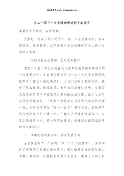 / 【七哥公文】2024年:在二十届三中全会精神研讨班上的发言+更多免费公文+VX:QiGeGongWen2024