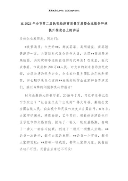 【七哥公文】2024年:在2024年全市第二届民营经济高质量发展暨企业服务环境提升推进会上的讲话+更多免费公文+VX:QiGeGongWen2024