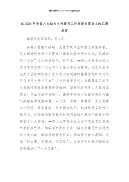 【七哥公文】2024年:在2024年全省人大助力乡村振兴工作座谈交流会上的汇报发言+更多免费公文+VX:QiGeGongWen2024