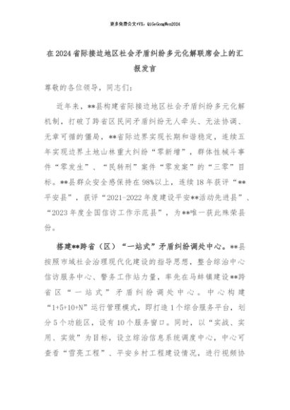 【七哥公文】2024年:在2024省际接边地区社会矛盾纠纷多元化解联席会上的汇报发言+更多免费公文+VX:QiGeGongWen2024