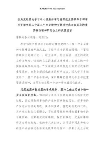 【七哥公文】2024年:在局党组理论学习中心组集体学习省部级主要领导干部学习贯彻党的二十届三中全会精神专题研讨班开班式上的重要讲话精神研讨会上的交流发言+更多免费公文+VX:QiGeGongWen2024