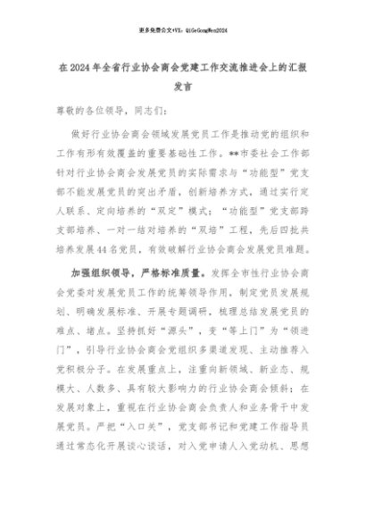 【七哥公文】2024年:在2024年全省行业协会商会党建工作交流推进会上的汇报发言+更多免费公文+VX:QiGeGongWen2024
