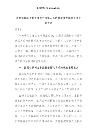 【七哥公文】2024年:在组织部机关树立和践行造福人民的政绩观专题座谈会上的讲话+更多免费公文+VX:QiGeGongWen2024
