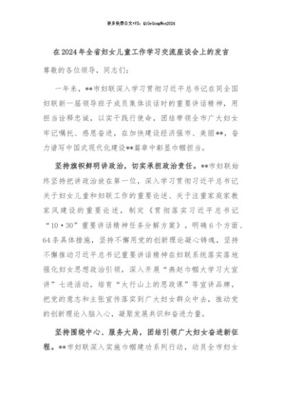 【七哥公文】2024年:在2024年全省妇女儿童工作学习交流座谈会上的发言+更多免费公文+VX:QiGeGongWen2024