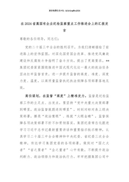 【七哥公文】2024年:在2024省属国有企业纪检监察重点工作推进会上的汇报发言+更多免费公文+VX:QiGeGongWen2024