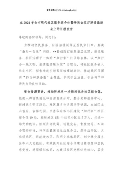 【七哥公文】2024年:在2024年全市现代社区服务综合体暨居民会客厅建设推进会上的汇报发言+更多免费公文+VX:QiGeGongWen2024