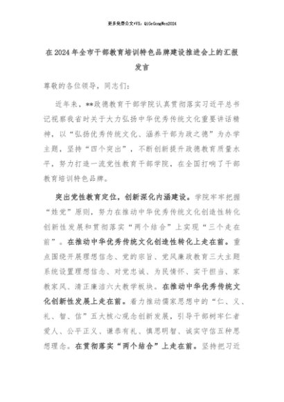 【七哥公文】2024年:在2024年全市干部教育培训特色品牌建设推进会上的汇报发言+更多免费公文+VX:QiGeGongWen2024