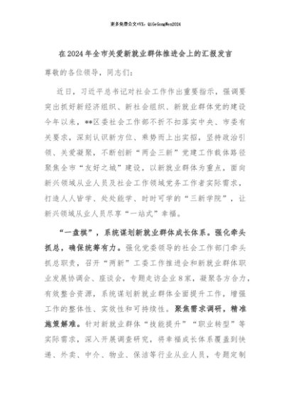 / 【七哥公文】2024年:在2024年全市关爱新就业群体推进会上的汇报发言+更多免费公文+VX:QiGeGongWen2024