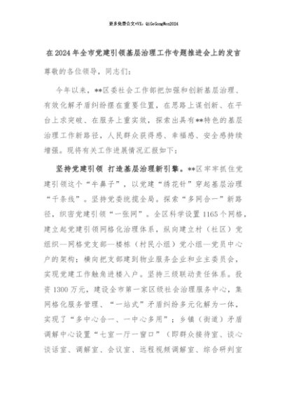 【七哥公文】2024年:在2024年全市党建引领基层治理工作专题推进会上的发言+更多免费公文+VX:QiGeGongWen2024