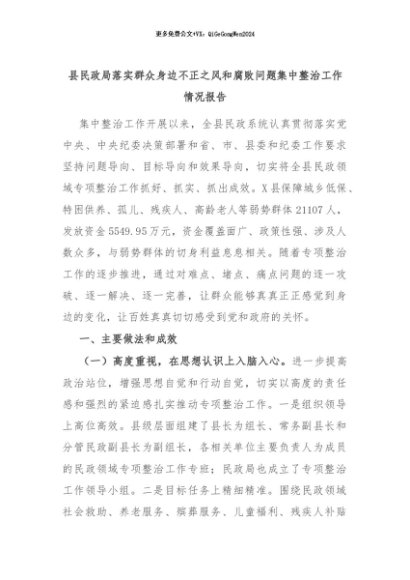 【七哥公文】2024年:县民政局落实群众身边不正之风和腐败问题集中整治工作情况报告+更多免费公文+VX:QiGeGongWen2024