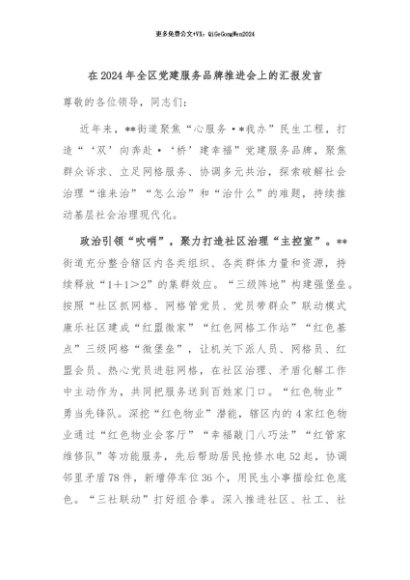 / 【七哥公文】2024年:在2024年全区党建服务品牌推进会上的汇报发言+更多免费公文+VX:QiGeGongWen2024