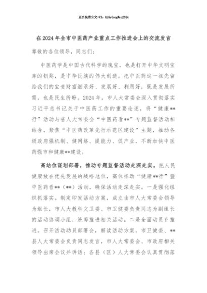 【七哥公文】2024年:在2024年全市中医药产业重点工作推进会上的交流发言+更多免费公文+VX:QiGeGongWen2024