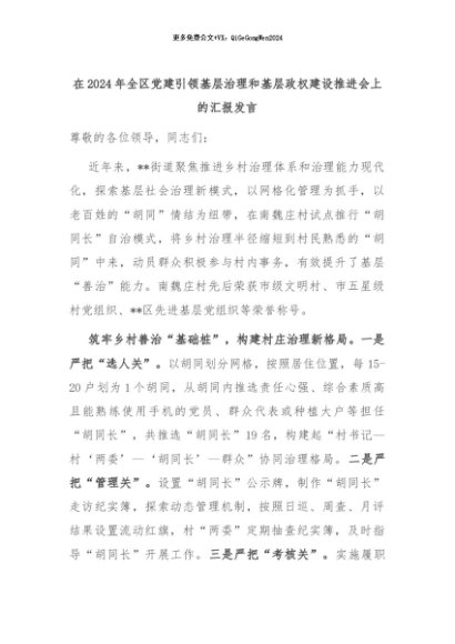 【七哥公文】2024年:在2024年全区党建引领基层治理和基层政权建设推进会上的汇报发言+更多免费公文+VX:QiGeGongWen2024