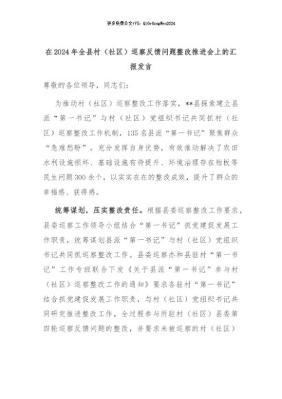 【七哥公文】2024年:在2024年全县村(社区)巡察反馈问题整改推进会上的汇报发言+更多免费公文+VX:QiGeGongWen2024