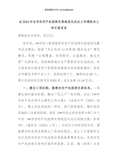 【七哥公文】2024年:在2024年全市农村产权流转交易规范化试点工作调度会上的汇报发言+更多免费公文+VX:QiGeGongWen2024