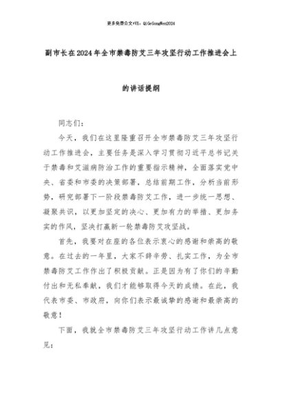 【七哥公文】2024年:副市长在2024年全市禁毒防艾三年攻坚行动工作推进会上的讲话提纲+更多免费公文+VX:QiGeGongWen2024