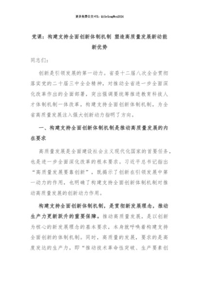 【七哥公文】2024年:党课:构建支持全面创新体制机制 塑造高质量发展新动能新优势+更多免费公文+VX:QiGeGongWen2024