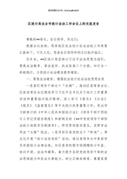 / 【七哥公文】2024年:区统计局在全市统计法治工作会议上的交流发言+更多免费公文+VX:QiGeGongWen2024