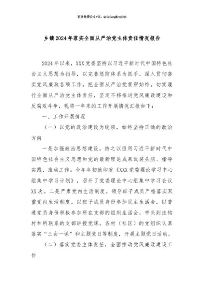/ 【七哥公文】2024年:乡镇2024年落实全面从严治党主体责任情况报告+更多免费公文+VX:QiGeGongWen2024