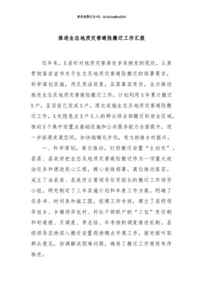 / 【七哥公文】2024年:推进生态地质灾害避险搬迁工作汇报+更多免费公文+VX:QiGeGongWen2024