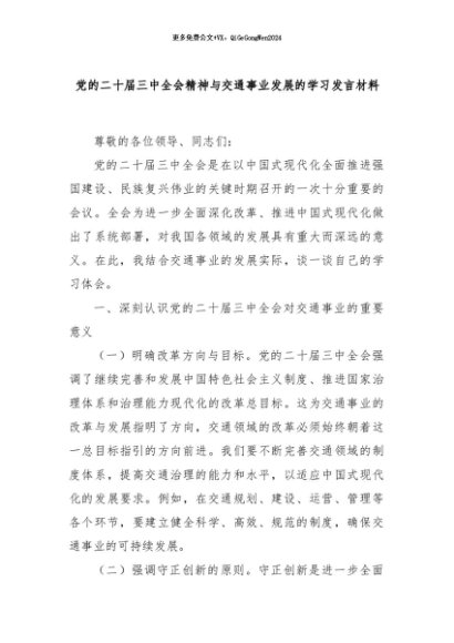 【七哥公文】2024年:党的二十届三中全会精神与交通事业发展的学习发言材料+更多免费公文+VX:QiGeGongWen2024