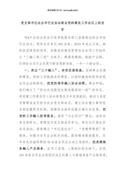 【七哥公文】2024年:党支部书记在全市行业协会商会党的建设工作会议上的发言+更多免费公文+VX:QiGeGongWen2024