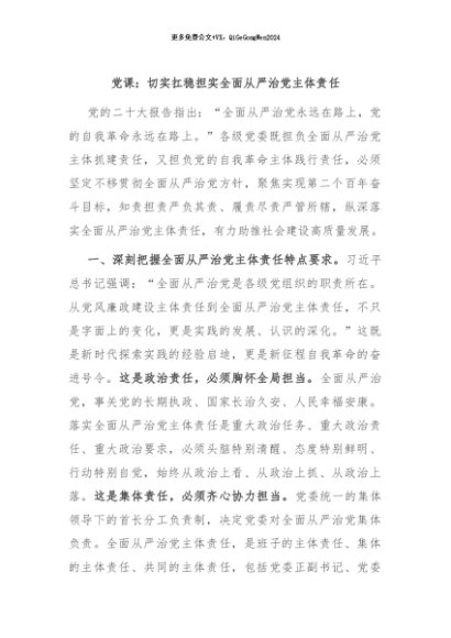 / 【七哥公文】2024年:党课:切实扛稳担实全面从严治党主体责任+更多免费公文+VX:QiGeGongWen2024