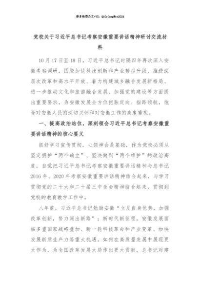 【七哥公文】2024年:党校关于习近平总书记考察安徽重要讲话精神研讨交流材料+更多免费公文+VX:QiGeGongWen2024