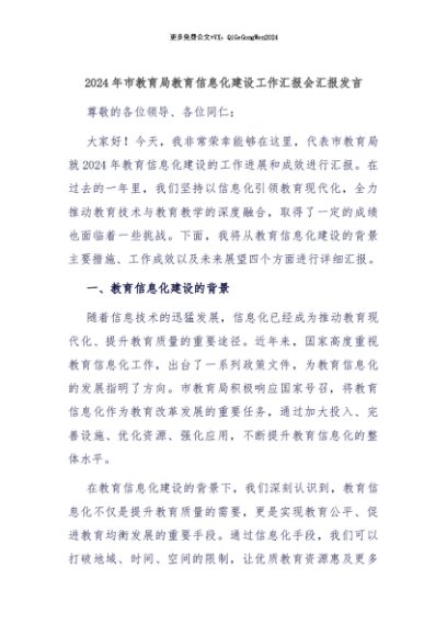 【七哥公文】2024年:2024年市教育局教育信息化建设工作汇报会汇报发言+更多免费公文+VX:QiGeGongWen2024
