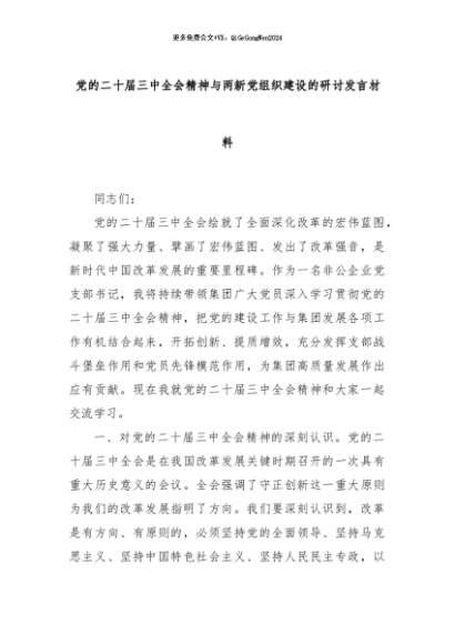 【七哥公文】2024年:党的二十届三中全会精神与两新党组织建设的研讨发言材料+更多免费公文+VX:QiGeGongWen2024