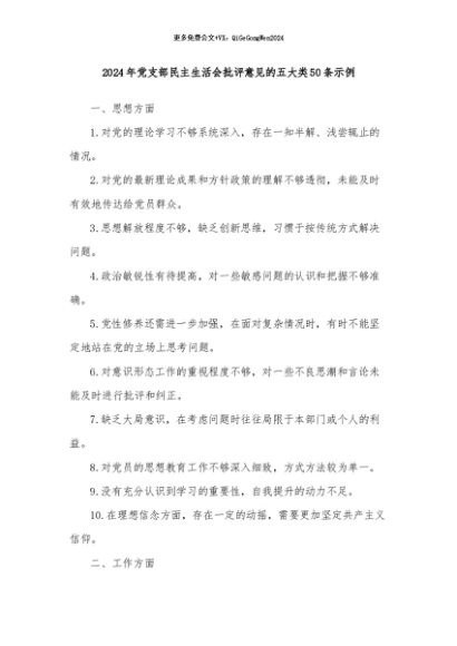 【七哥公文】2024年:2024年党支部民主生活会批评意见的五大类50条示例+更多免费公文+VX:QiGeGongWen2024