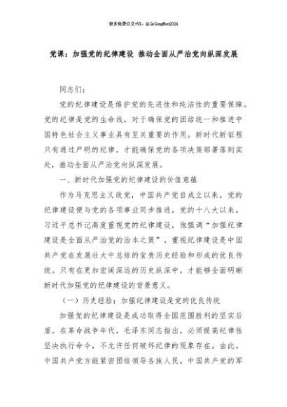 【七哥公文】2024年:党课:加强党的纪律建设 推动全面从严治党向纵深发展+更多免费公文+VX:QiGeGongWen2024