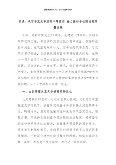 【七哥公文】2024年:党课:从百年党史中汲取丰厚营养 奋力推动单位建设高质量发展+更多免费公文+VX:QiGeGongWen2024